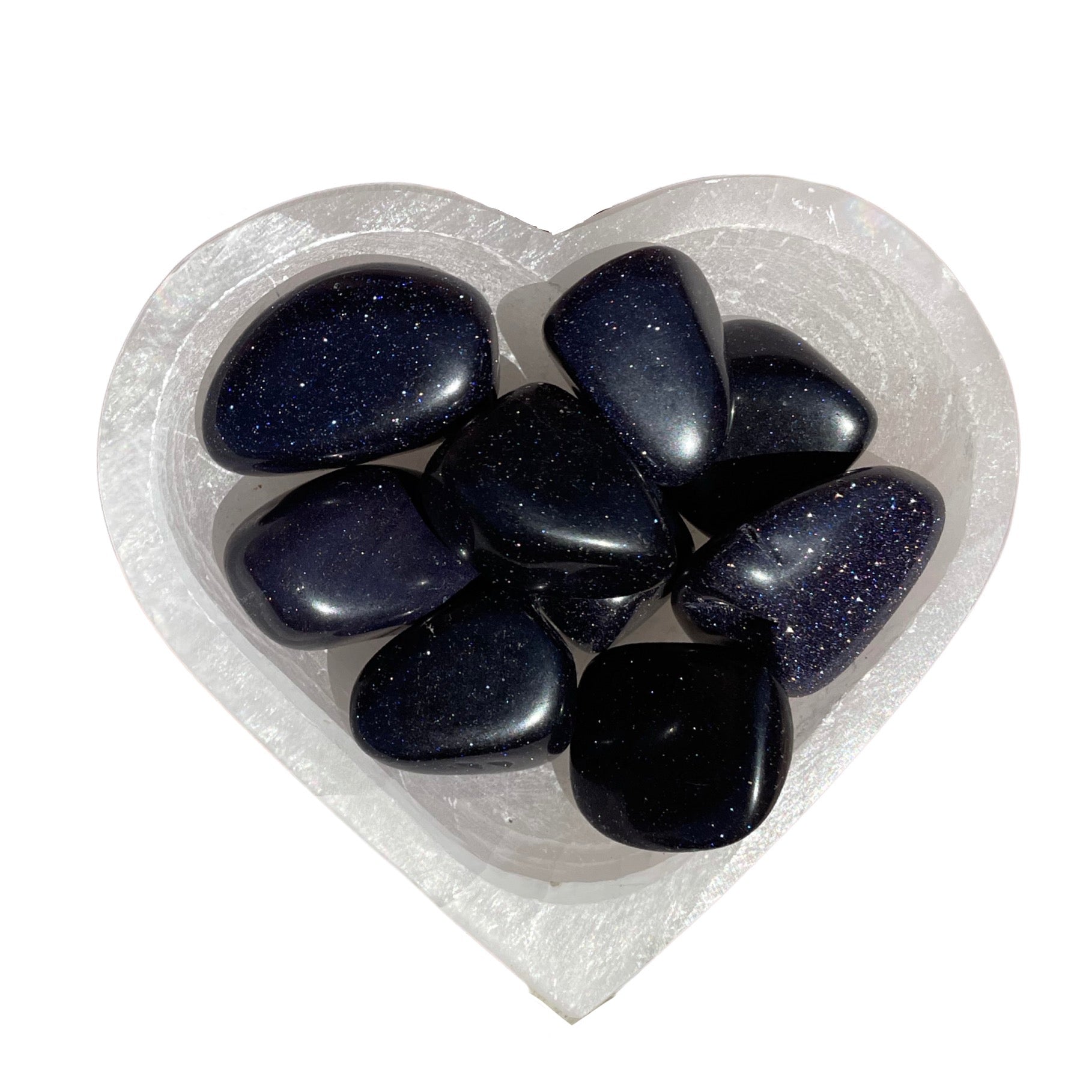 Blue Goldstone is a man-made stone. The sparkles it reflects are copper. This stone is said to be an uplifting stone. It is the stone of confidence and ambition, encouraging motivation and drive.